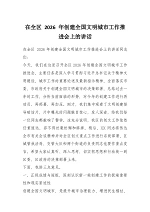 在全区 2026 年创建全国文明城市工作推进会上的讲话