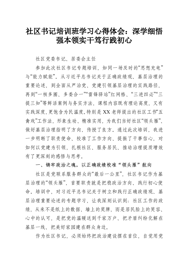 - 社区书记培训班学习心得体会:深学细悟强本领 实干笃行践初心
