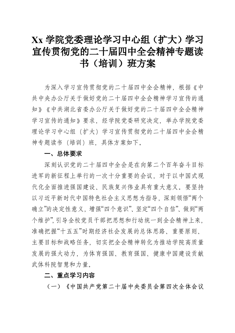 Xx学院党委理论学习中心组(扩大)学习宣传贯彻党的二十届四中***精神专题读书(培训)班方案