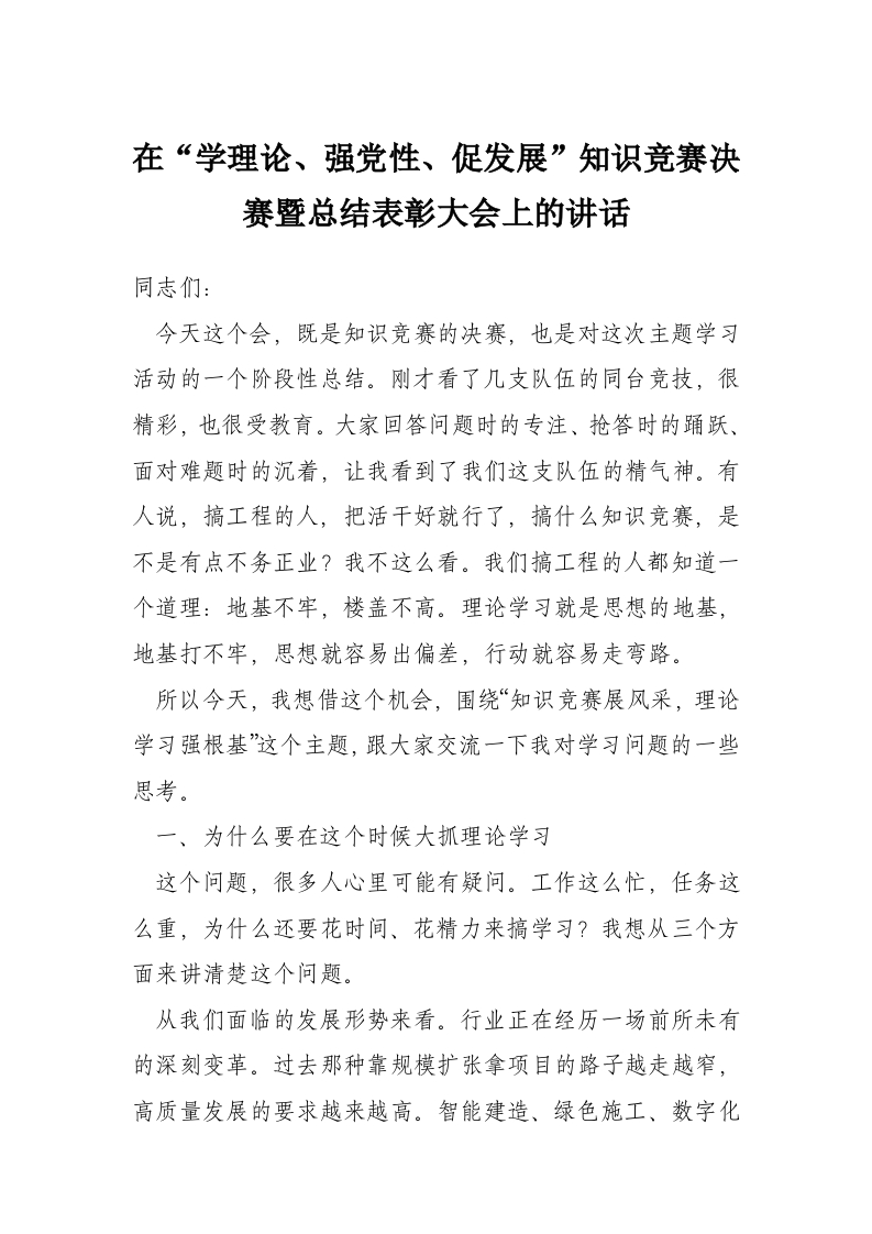 - 在学理论、强党性、促发展知识竞赛决赛暨总结表彰大会上的讲话