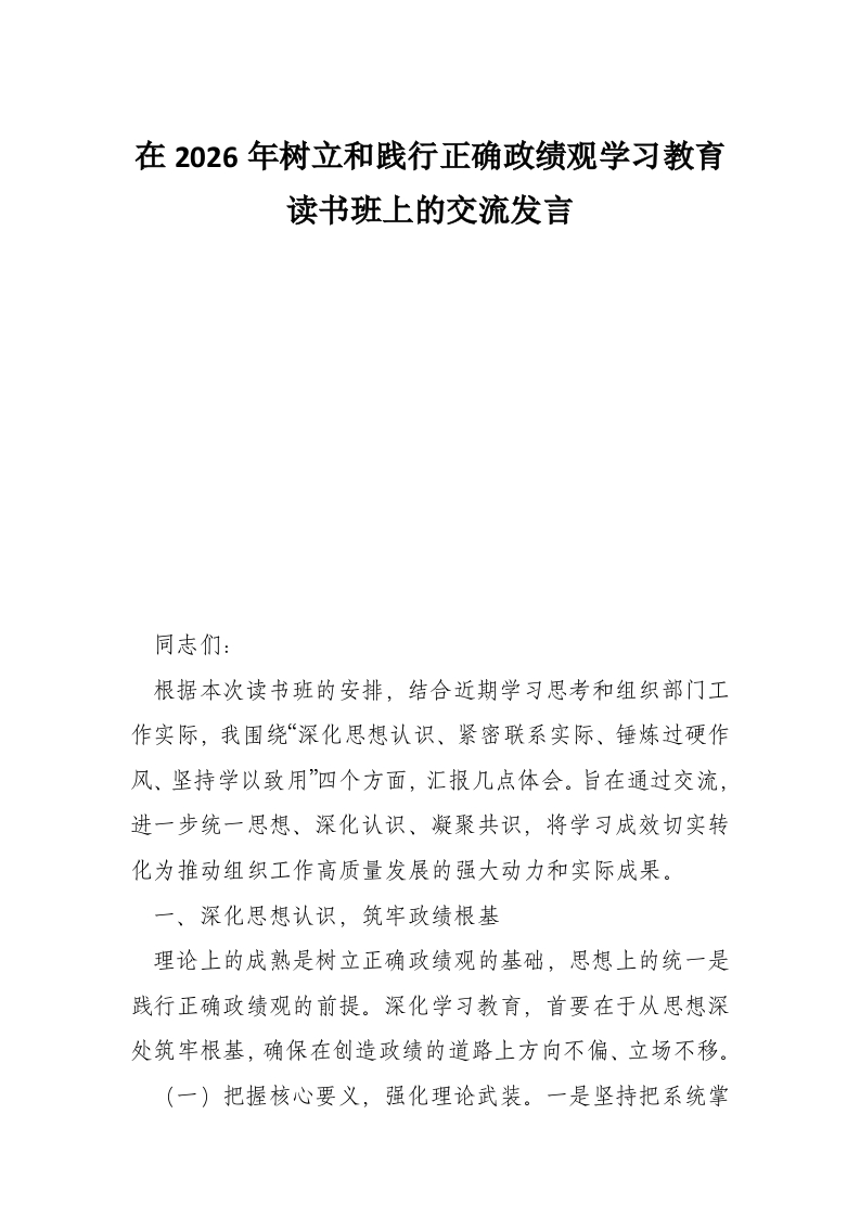 - 在树立和践行正确政绩观学习教育读书班上的交流研讨发言(1)