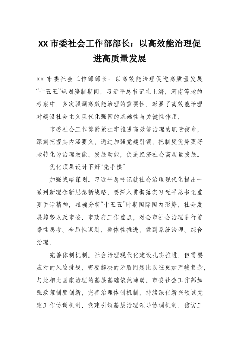 - XX市委社会工作部部长:以高效能治理促进高质量发展