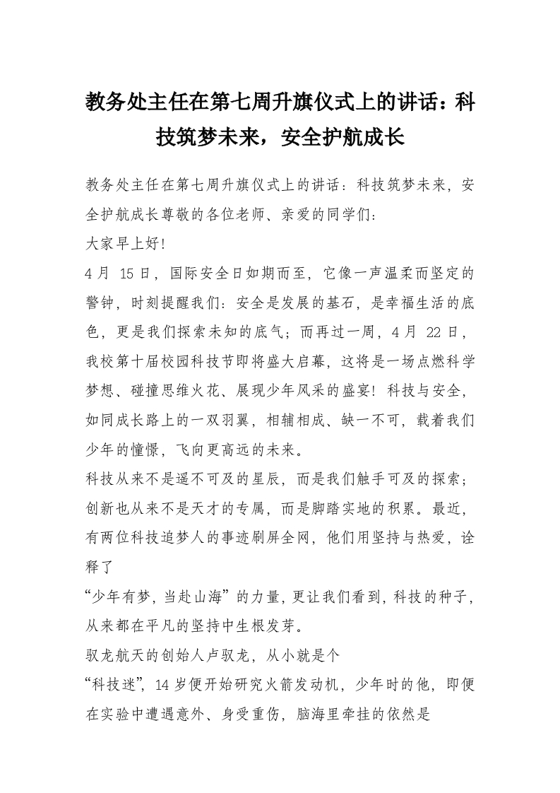 教务处主任在第七周升旗仪式上的讲话:科技筑梦未来,安全护航成长