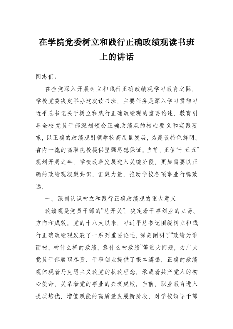 - 在区领导干部政绩观读书班上的研讨发言