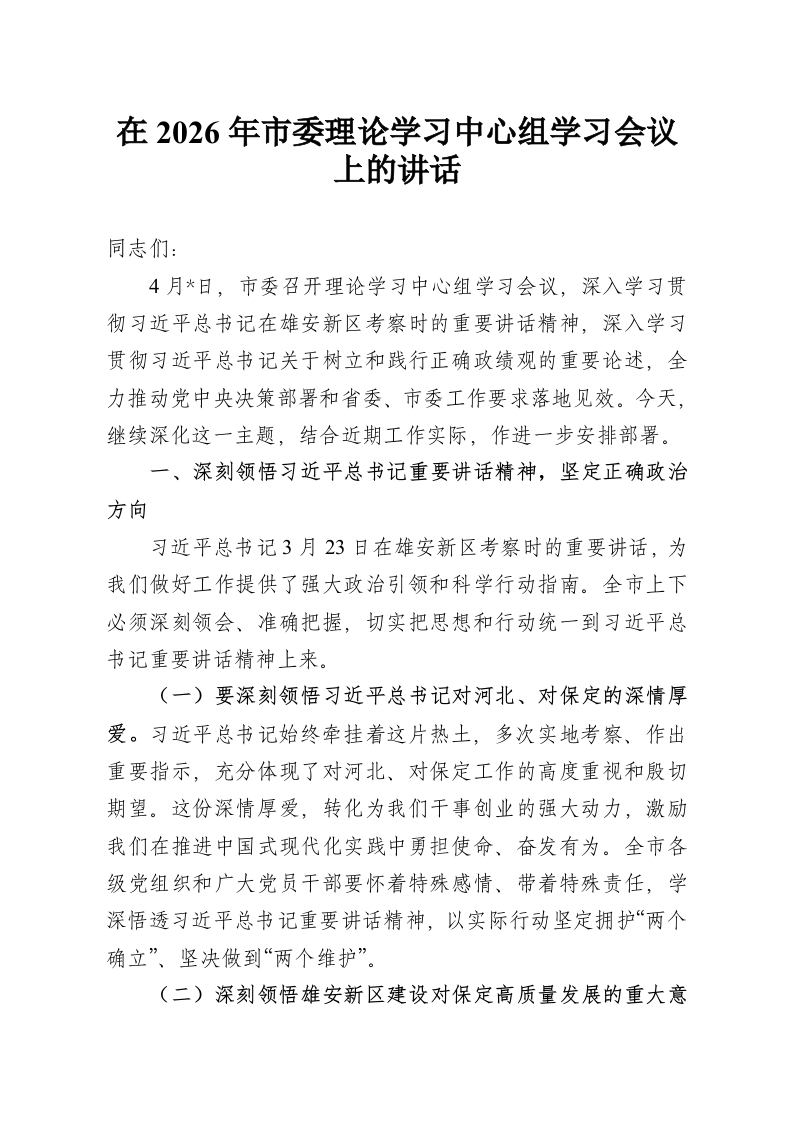 在2026年市委理论学习中心组学习会议上的讲话