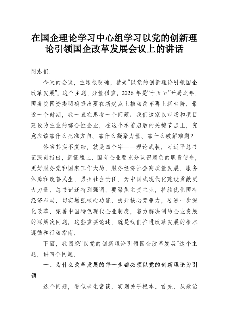 在国企理论学习中心组学习以党的创新理论引领国企改革发展会议上的讲话