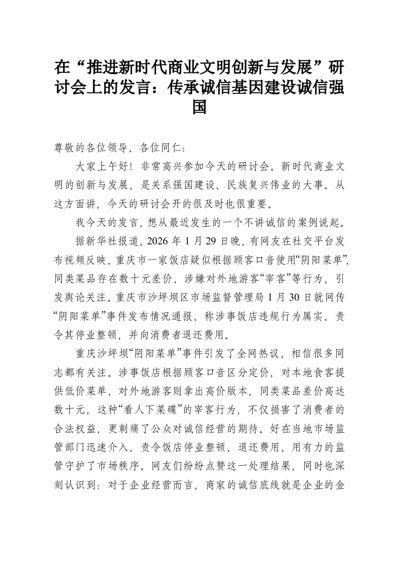 在“推进新时代商业文明创新与发展”研讨会上的发言:传承诚信基因建设诚信强国